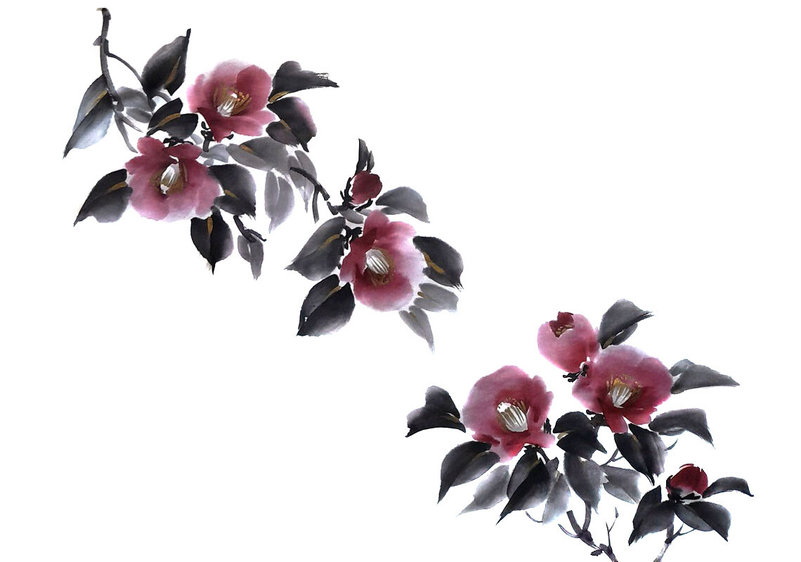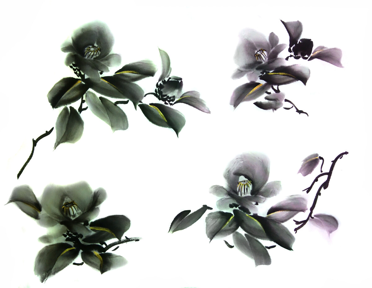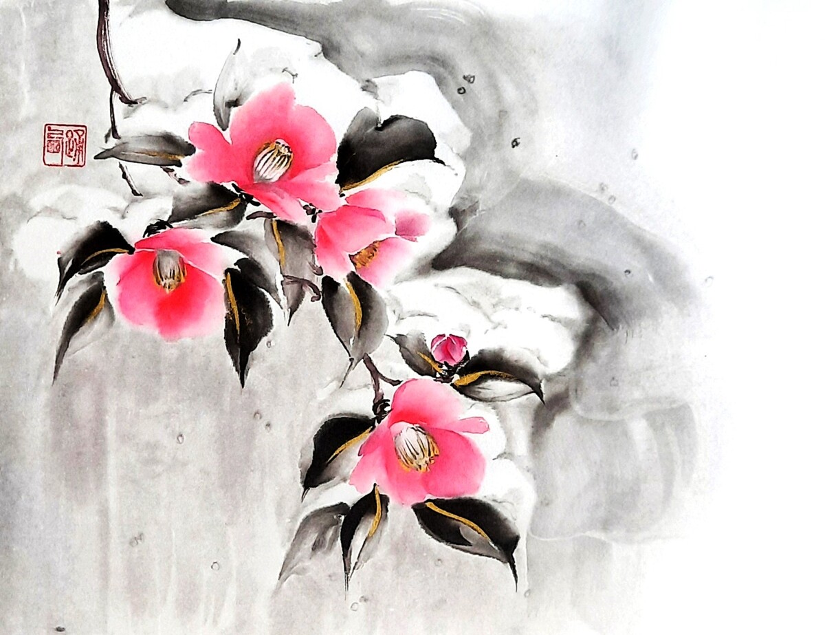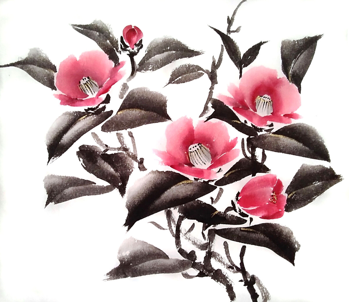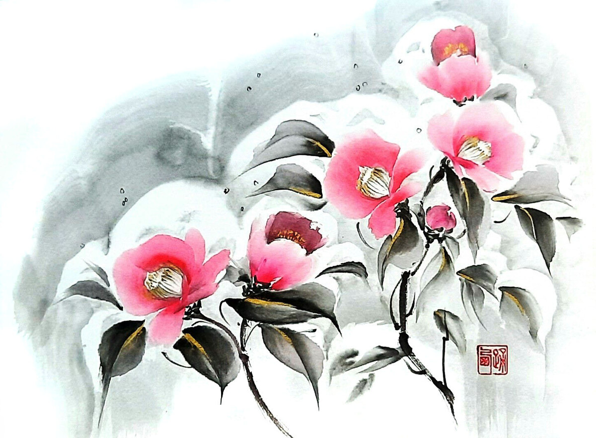 1. 4 готовых композиций на тему цветка камелии в разных техниках.