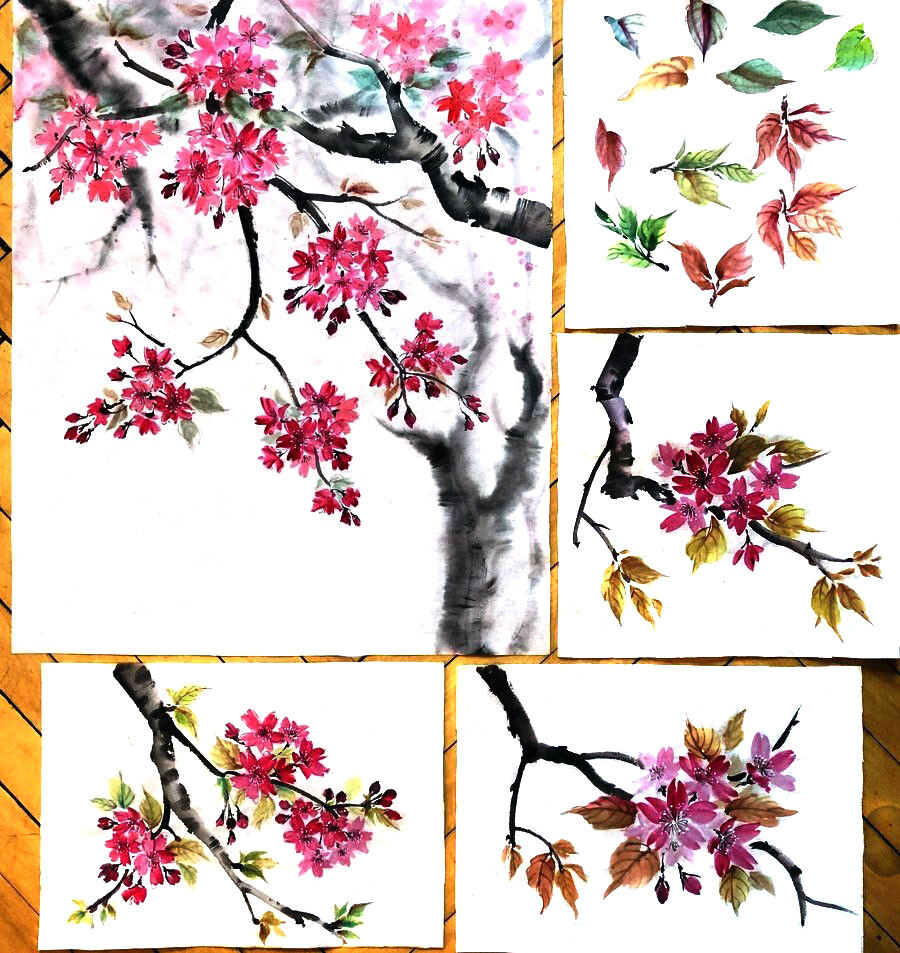 Блок состоит из 4 уроков в которых мы учимся использовать цвет в технике суми-э. В данных упражнениях мы разбрем палитру оттенков для написания цветов и листьев, а так же тональные характеристики сюжета.