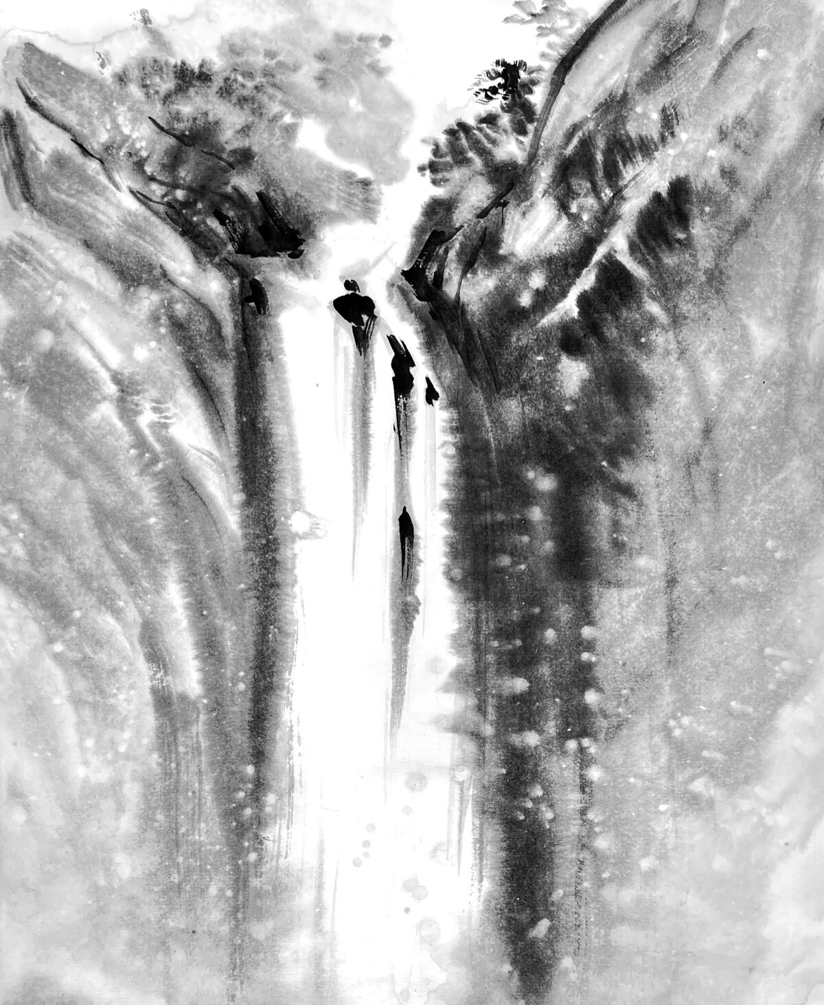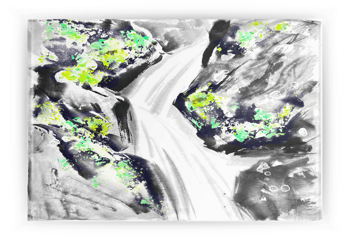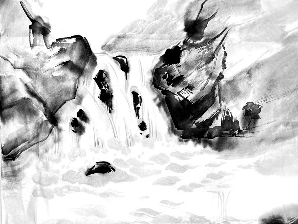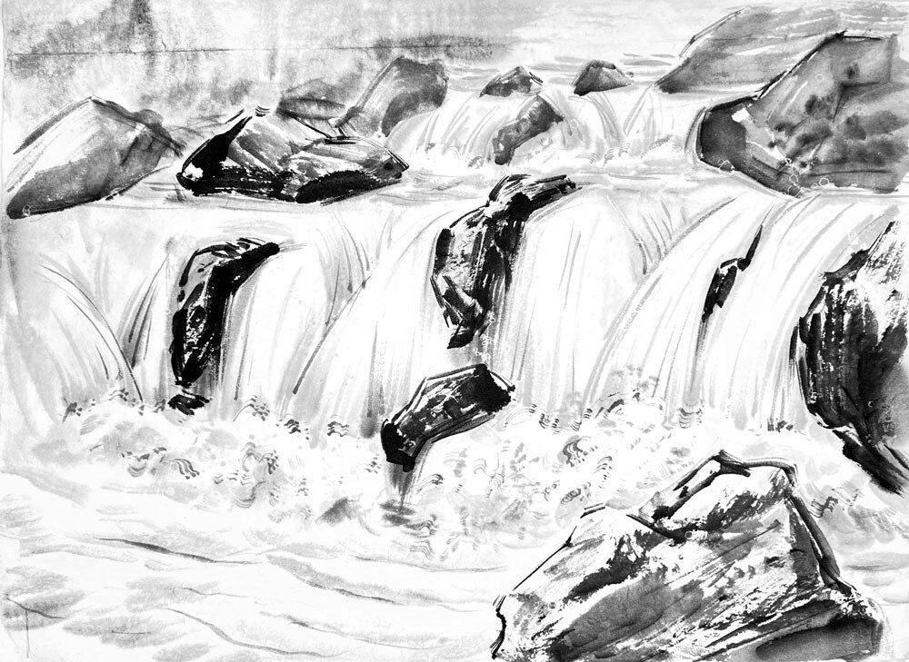 Так же изображение горных порогов, созданию фактур на камнях и силуэтов деревьев на склонах водопадов.